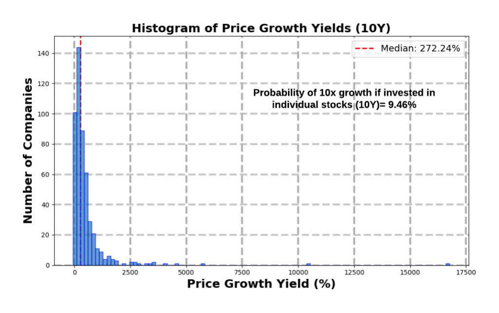 Roughly 10% of S&P 500 companies achieved over 10x growth in the last decade. This relatively high probability reveals the potential of individual stock investing, despite its risks.