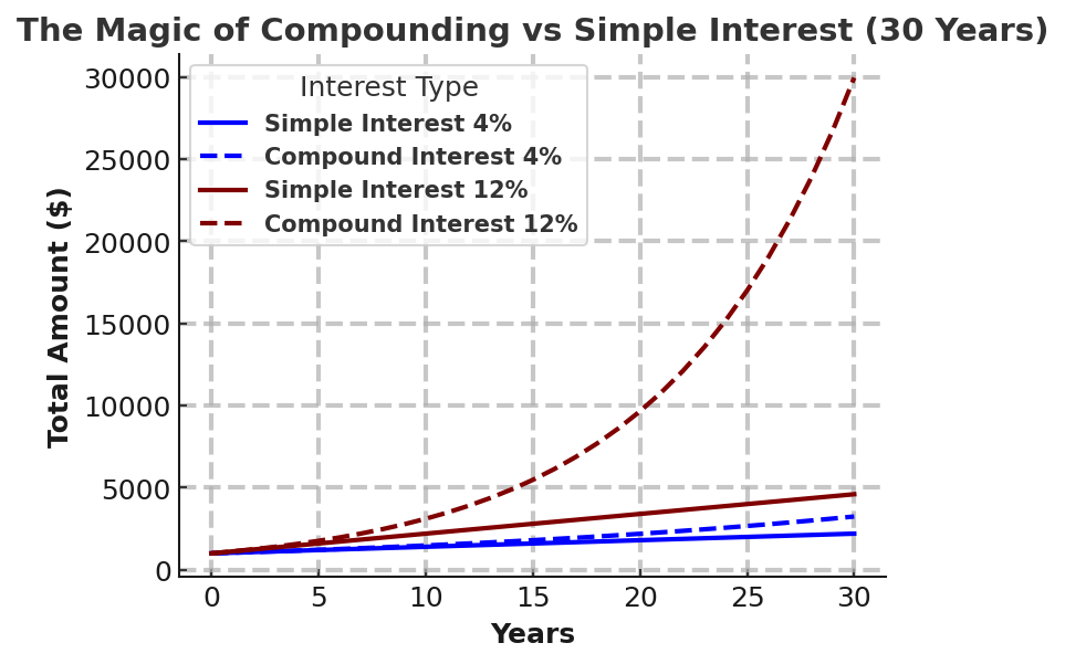 The image compares simple and compound interest growth in simulation. The simple interest line grows steadily, adding a consistent amount yearly. The compound interest curve starts similarly but eventually accelerates, as it builds on both the principal and accumulated interest, creating exponential growth. This illustrates that, in finance and personal growth, small, consistent efforts over time lead to significant results.